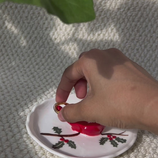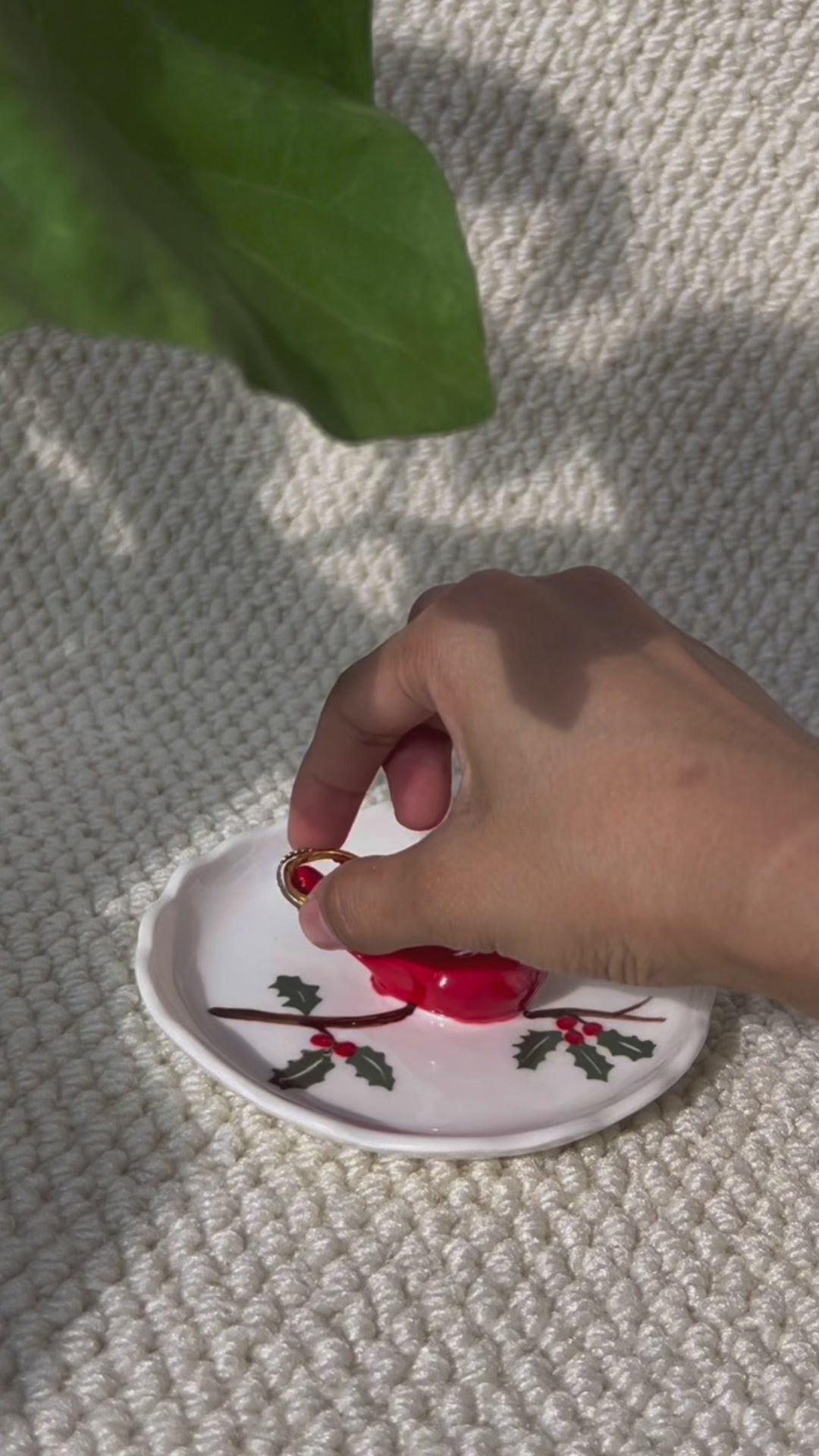 Bring a touch of nature and holiday charm to your home with this Red Cardinal Ceramic Jewelry Dish. Handcrafted with care, this trinket plate features a bright red cardinal perched on a branch with holly leaves and berries – a timeless symbol of love, hope, and joy.
